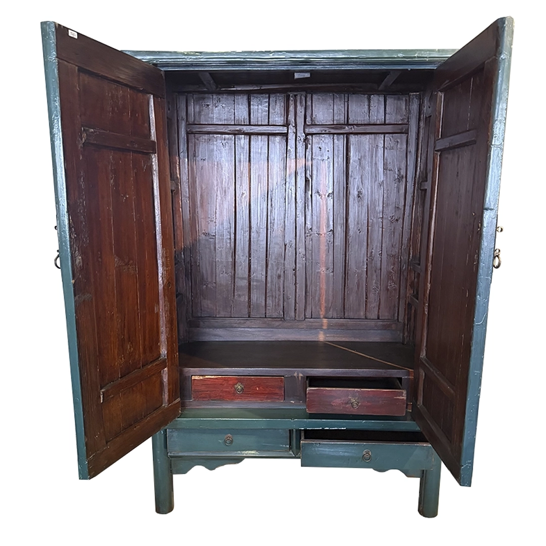 Armario chino de madera pintado a mano con dos puertas y cajones inferiores.