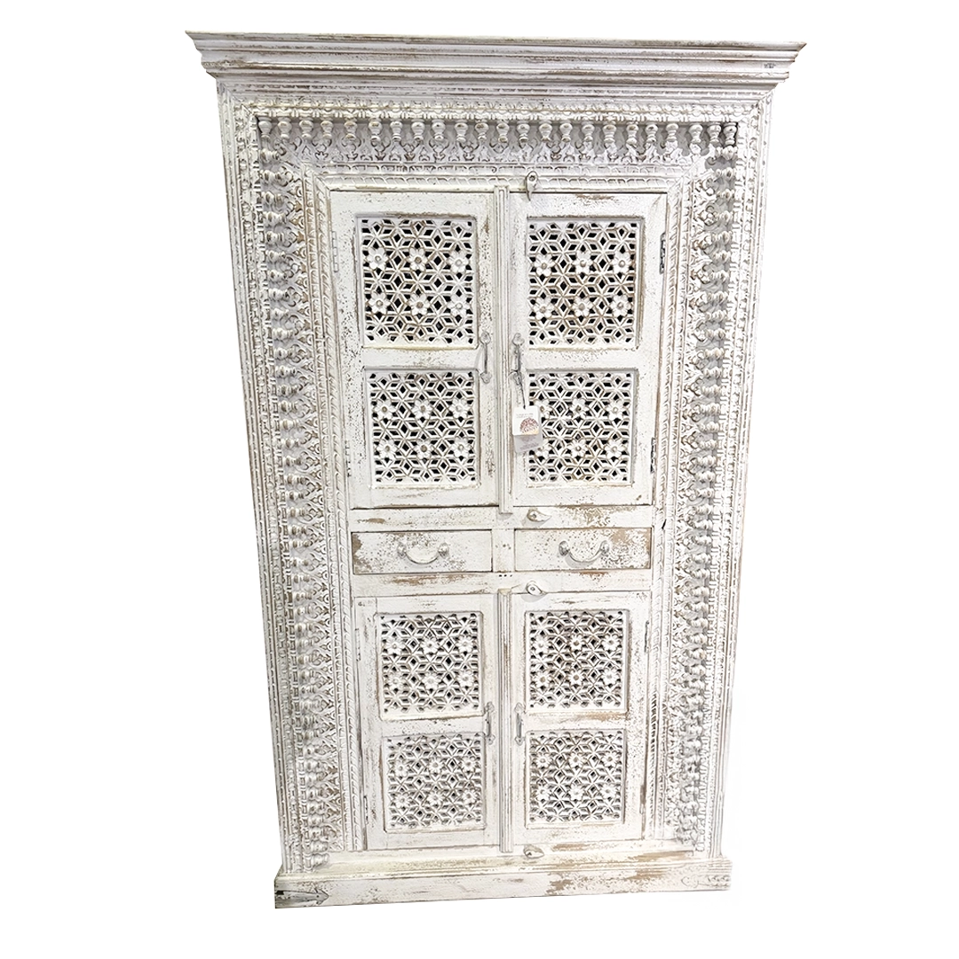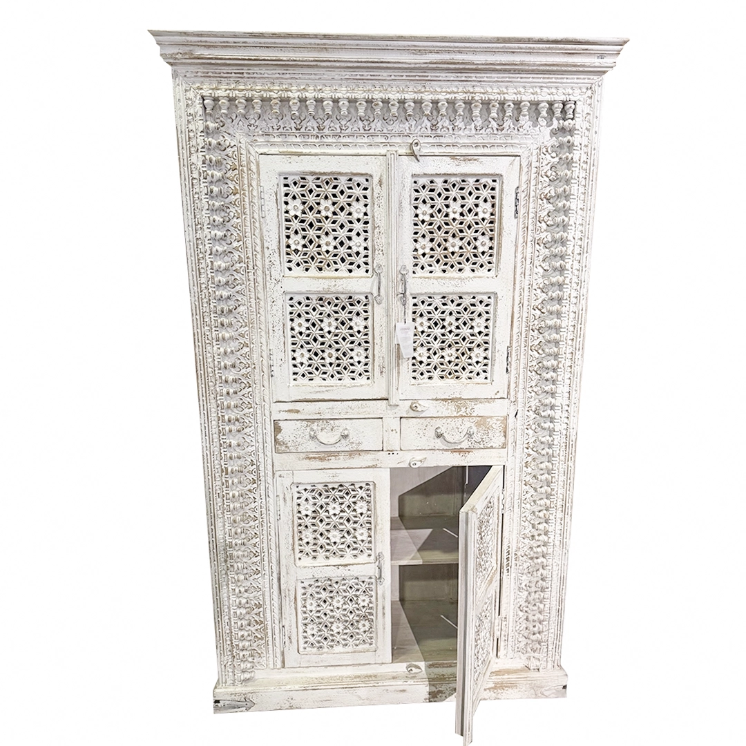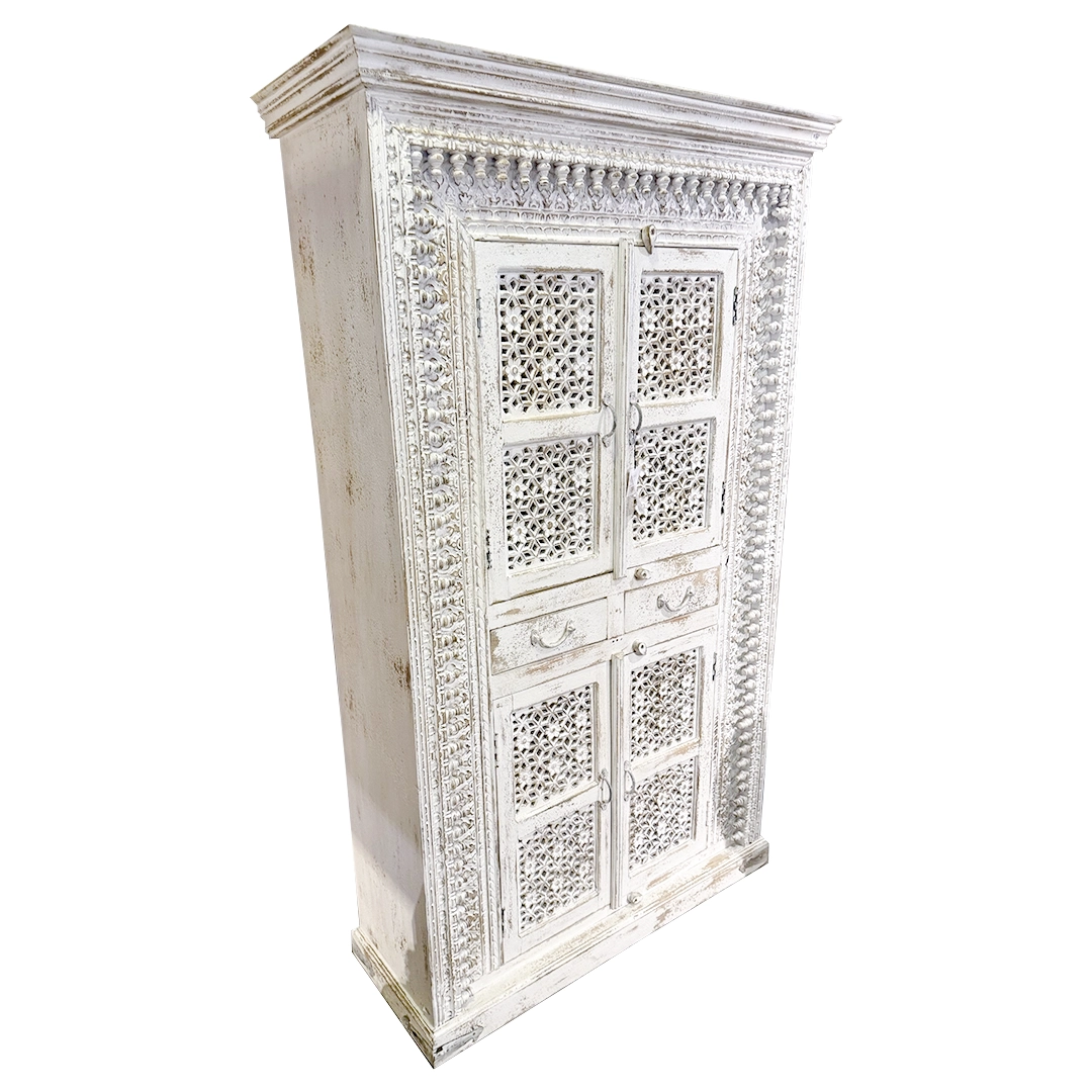 Armario tallado de madera blanca. Cuenta con dos puertas en dos espacios decorativos y dos cajones centrales.