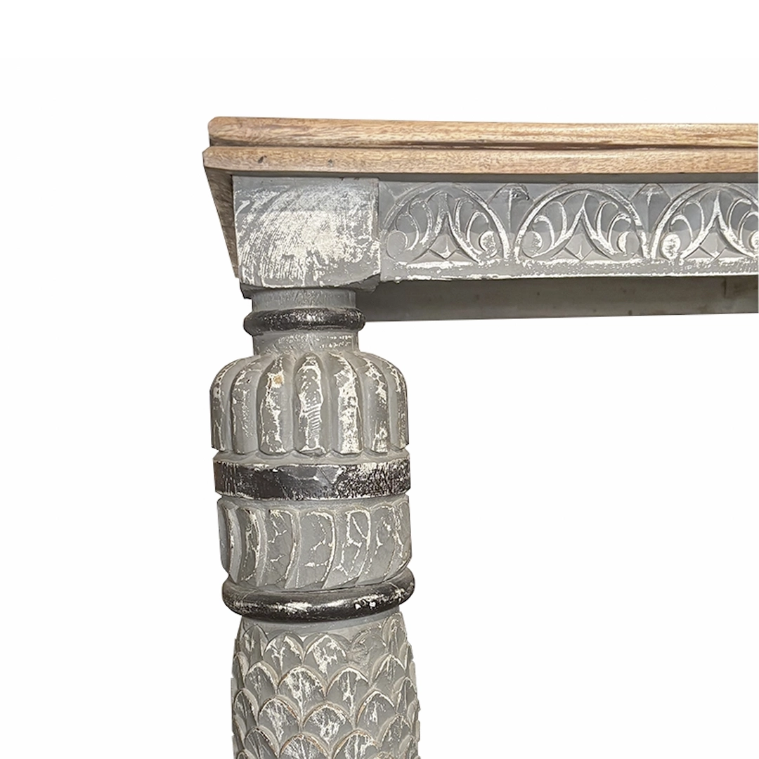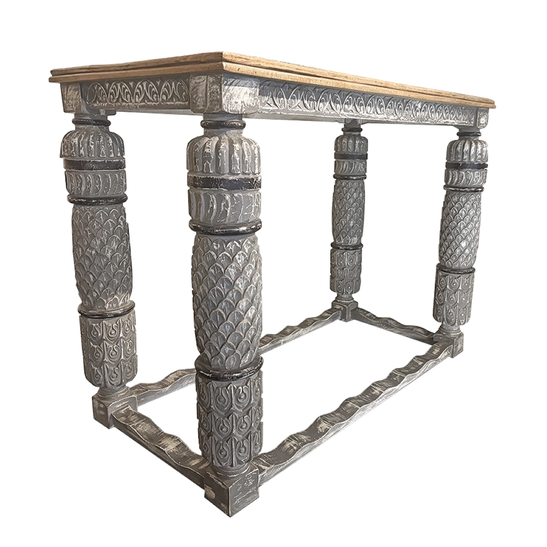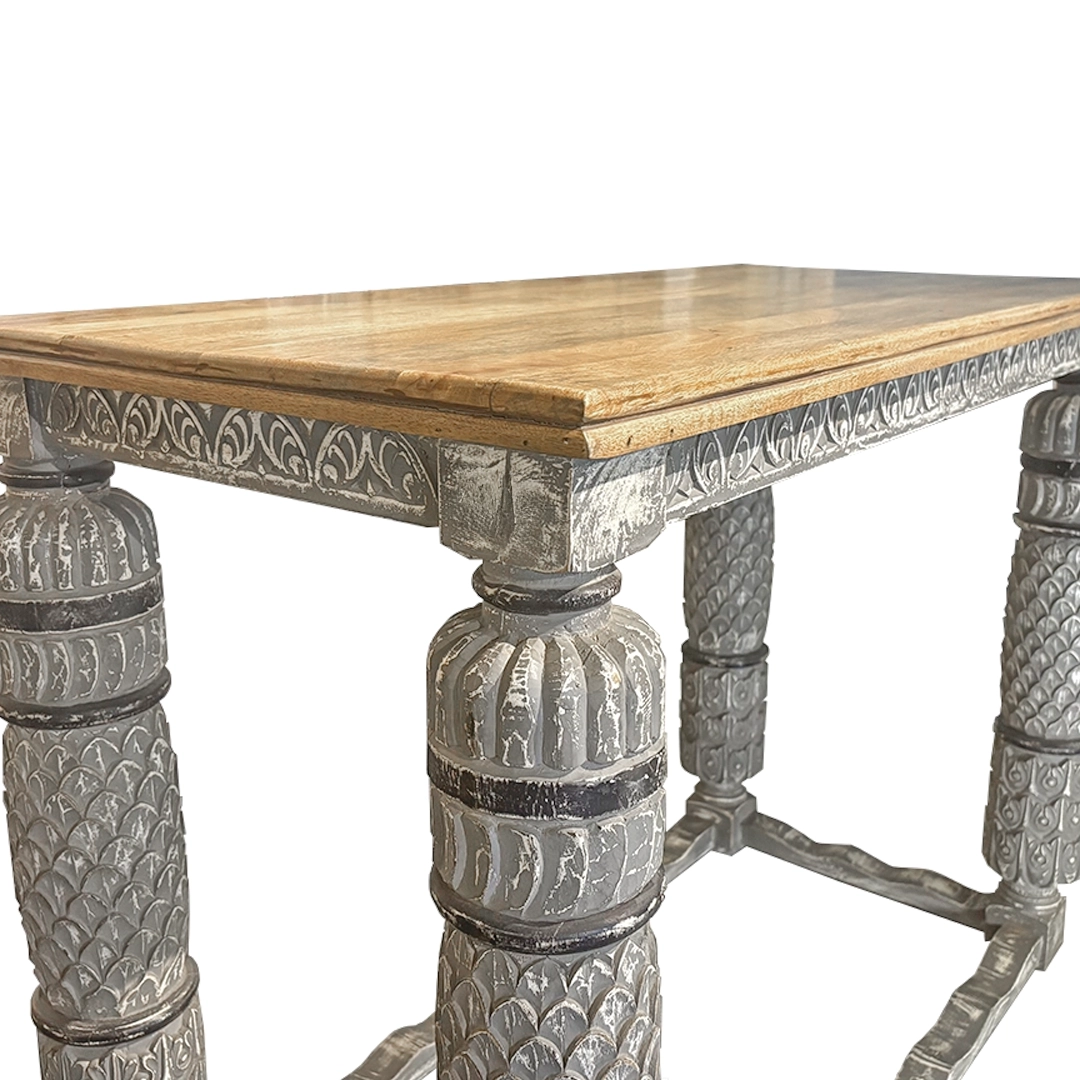 Consola con patas talladas a mano color crudo y repisa superior en color café.