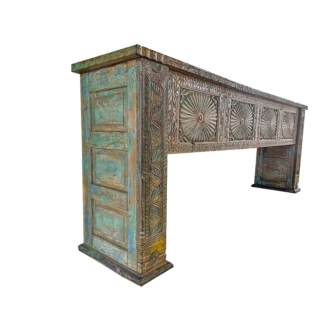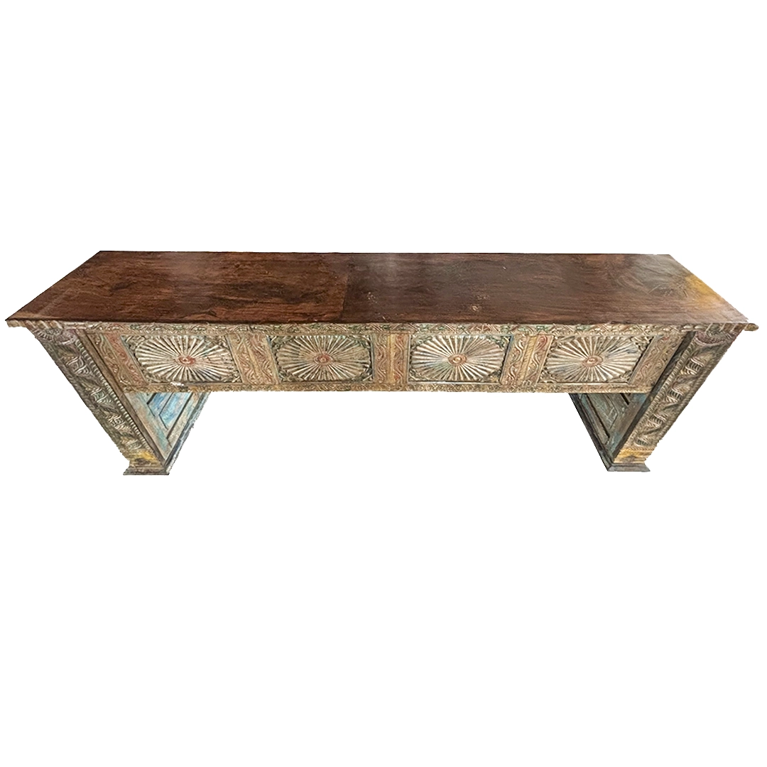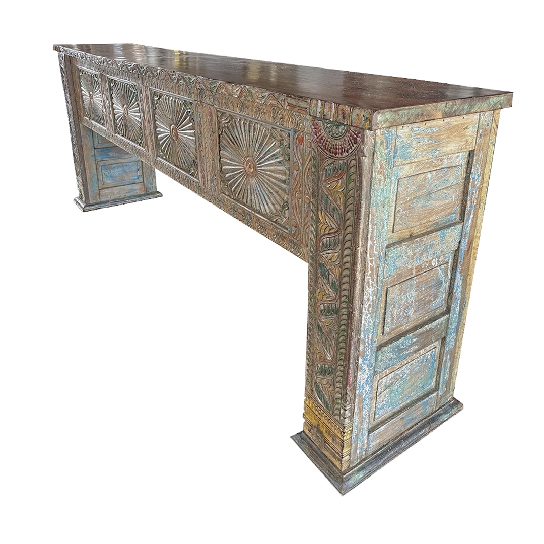 Consola de madera tallada y pintada a mano con detalles en ondas.