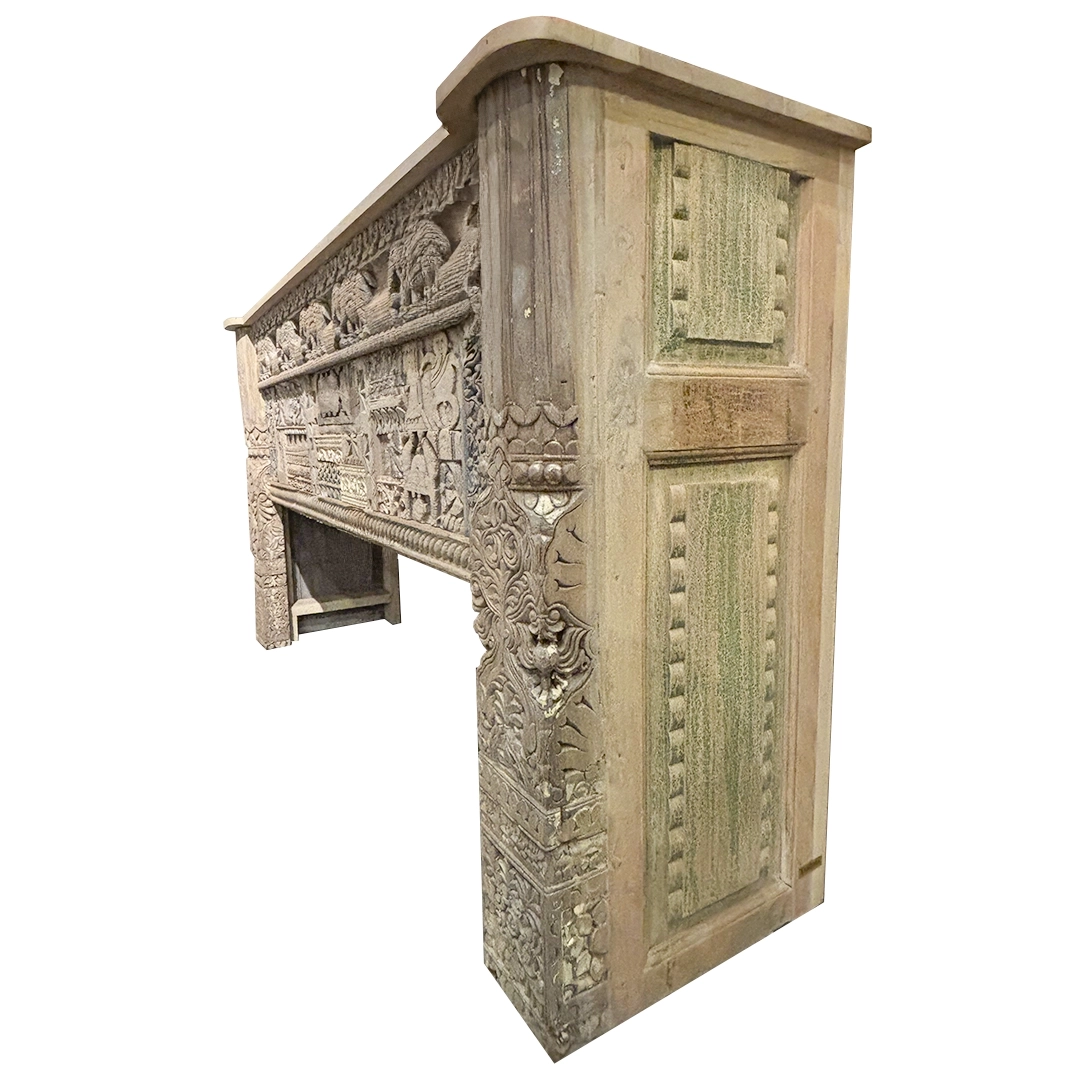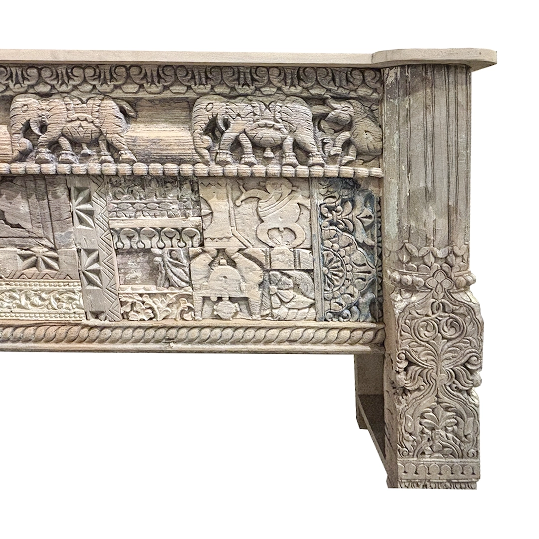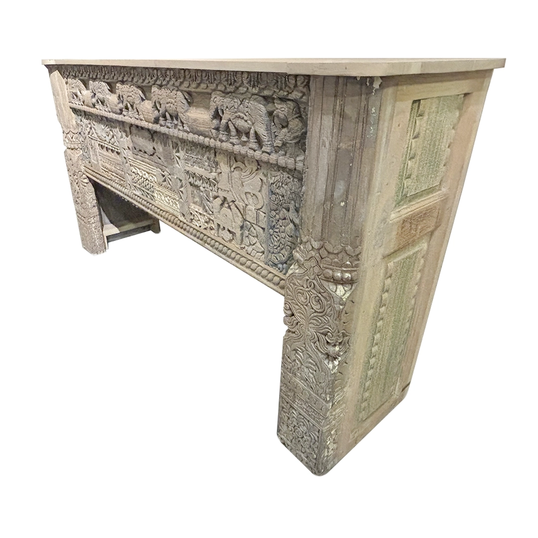 Consola tallada a mano con detalles como elefantes, flores, entre otros.