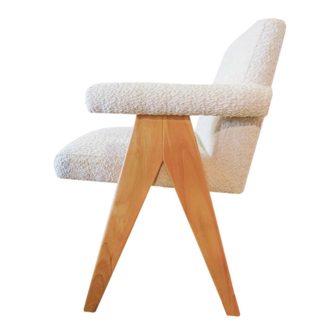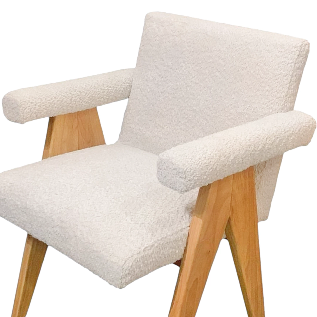 Silla con espaldar rectangular, reposabrazos en tela bouclé y patas en madera amarilla