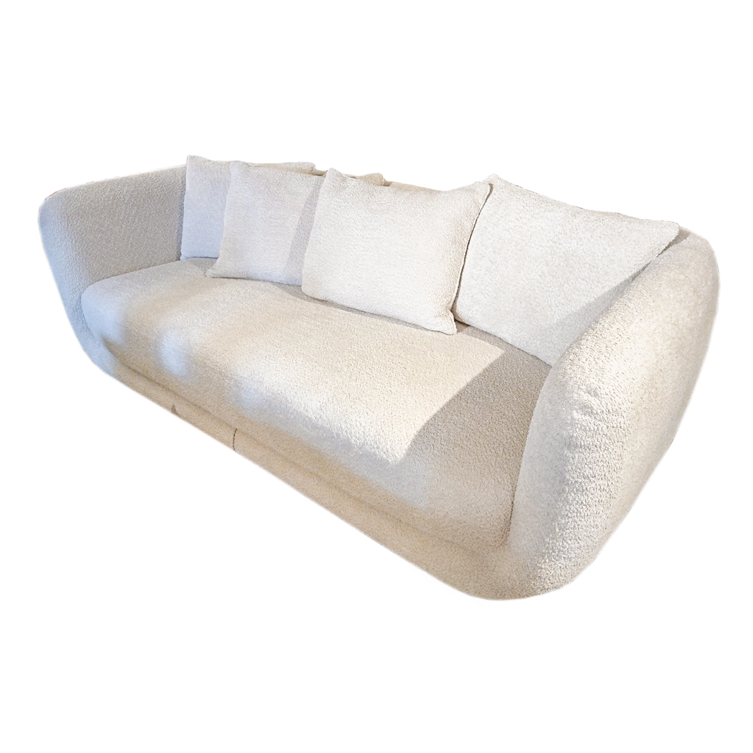 Sofá con diseño curvo y forma continua que integra respaldo, brazos y base todo en una sola pieza. Incluye cuatro cojines.